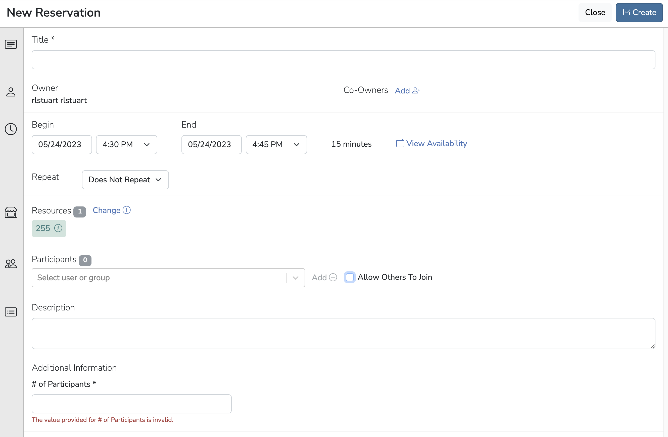 Don't forget to fill in the Title of your reservation and # of Participants fields!