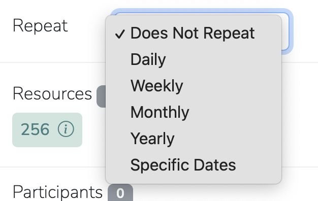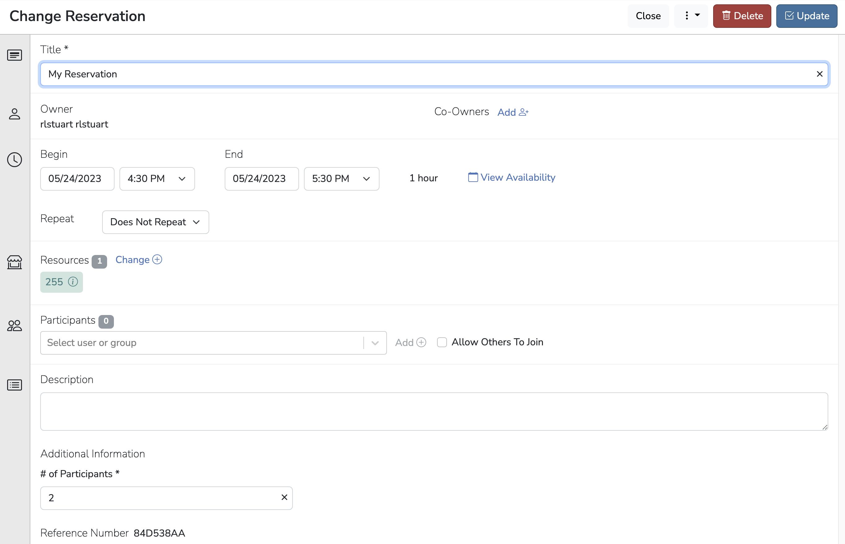 This screen will automatically fill with your current reservation details. You can change all of them: change the room, the time, and add participants (more below on that).