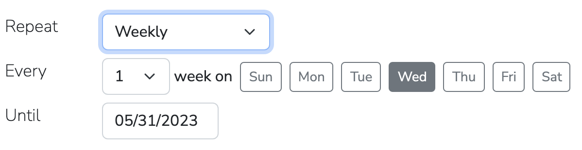 After selecting day of week, or every # of days/months, select an end date with the "Until" option.