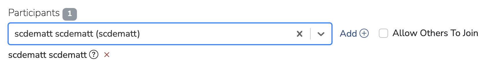To add a Participant: from the Create/Edit a Reservation screen, type the user's name or email address in the Add box. Select their name from the list. Names will appear in the box below. Names can be removed by clicking the red X next to the name.